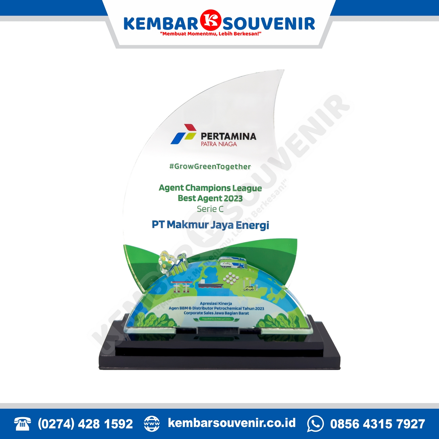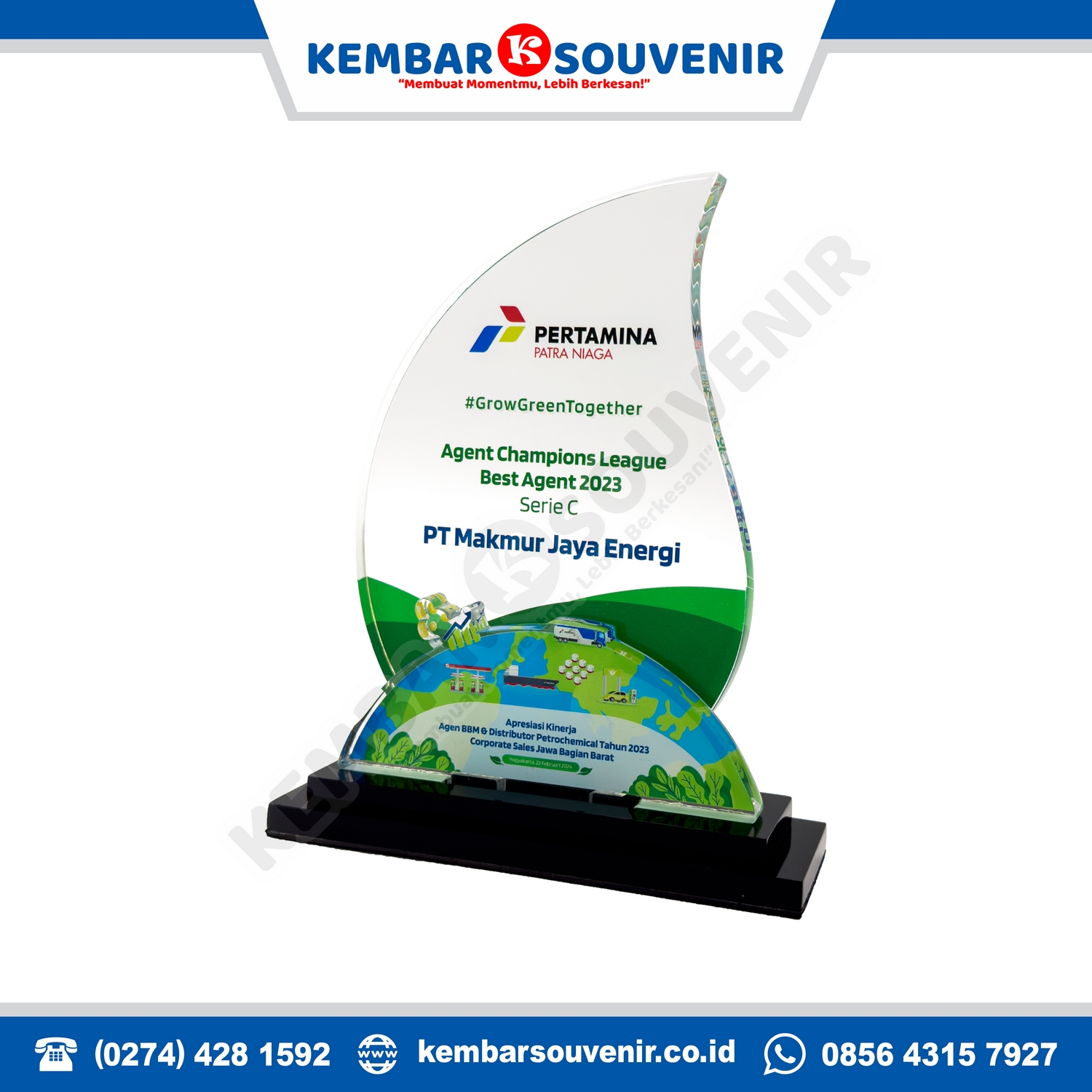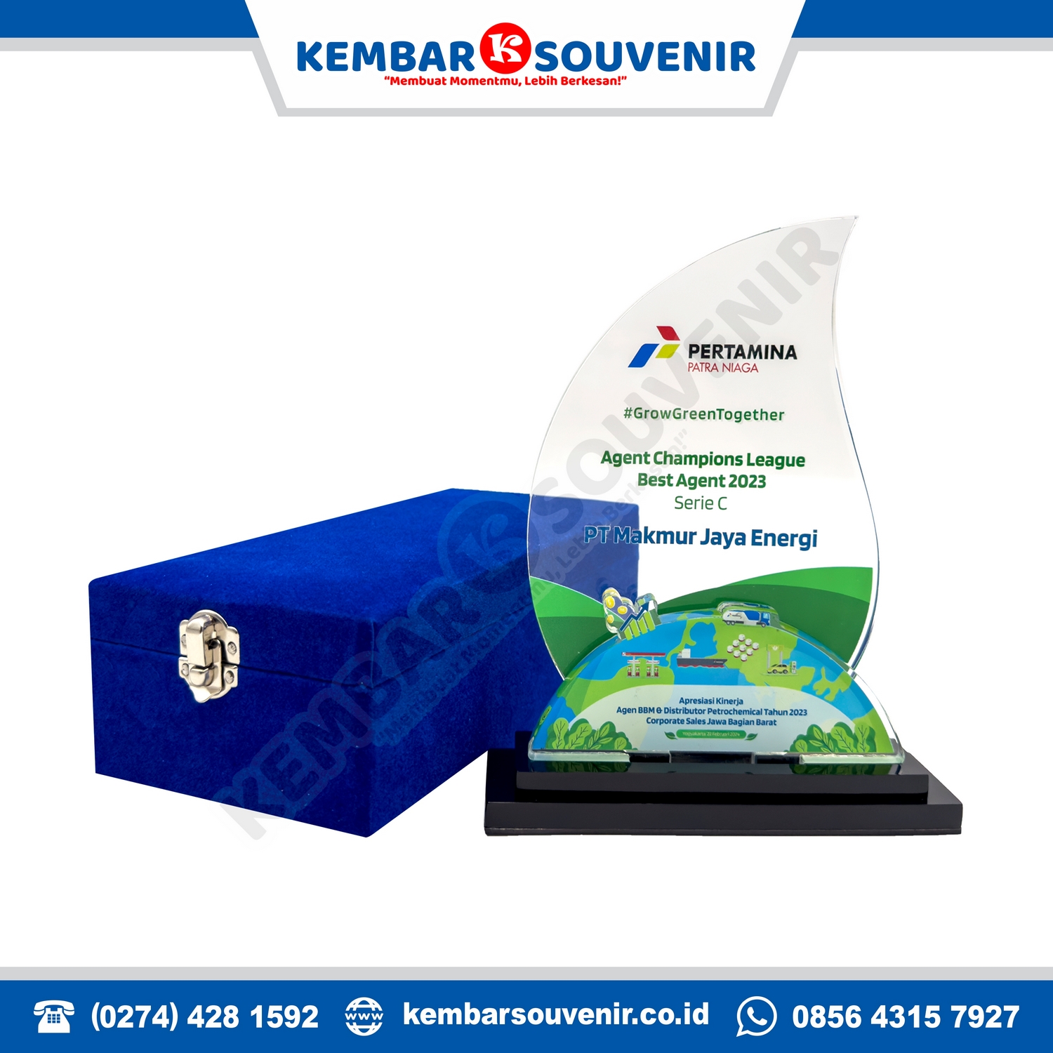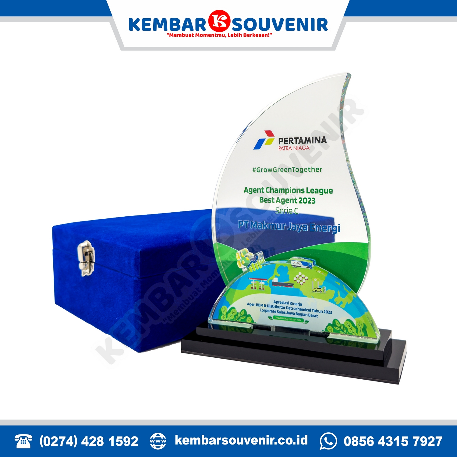 Gambar di atas menunjukkan contoh bentuk plakat penghargaan berbentuk tetesan air (tear drop) yang elegan dan profesional. Desain ini menggambarkan harmoni antara estetika modern dan fungsi simbolik dalam dunia penghargaan bisnis maupun korporat.