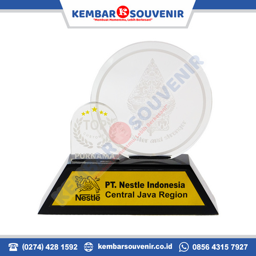 Bagian dasar piala berwarna hitam dengan bentuk segi empat memanjang. Di depannya terdapat plat kuning dengan logo Nestlé dan tulisan “PT. Nestlé Indonesia Central Java Region” yang memberi kesan profesional dan eksklusif. Kombinasi akrilik bening dan dasar hitam glossy membuat tampilan piala ini tampak mewah dan berkelas.