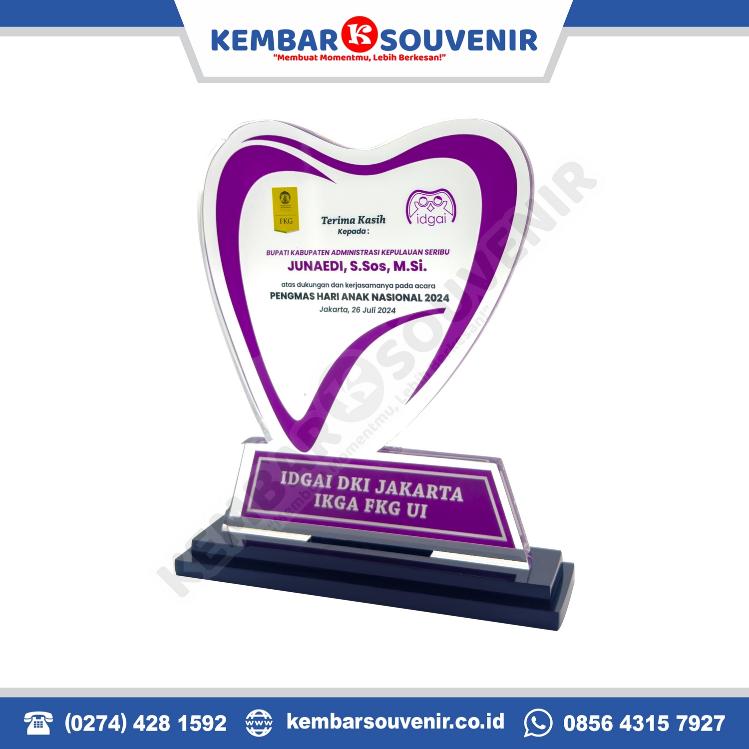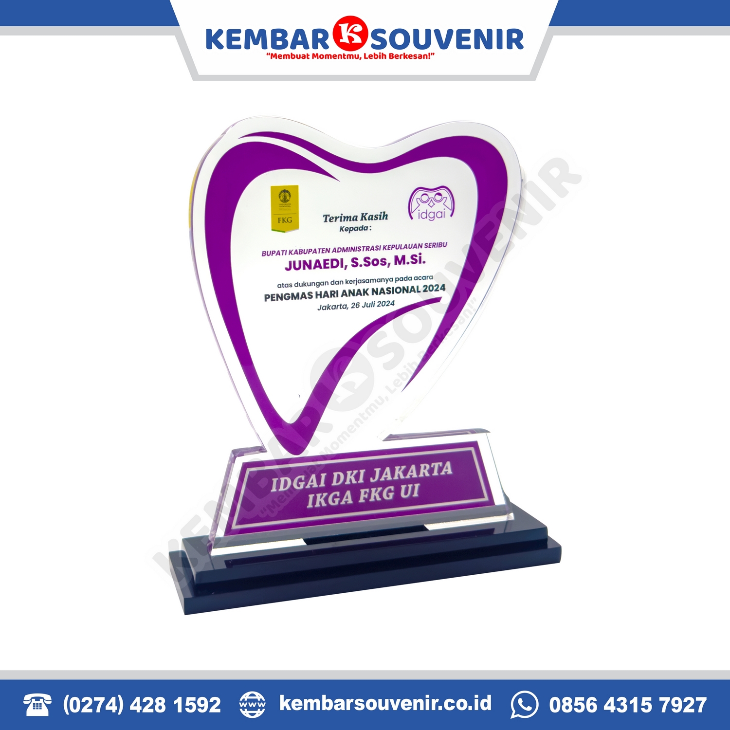 Dengan bentuk hati dan kombinasi warna ungu, piala ini mencerminkan apresiasi, kehormatan, dan rasa terima kasih yang tulus kepada penerima penghargaan.