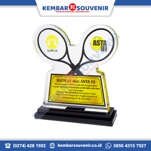 Plakat ini terbuat dari bahan akrilik berkualitas tinggi yang memiliki kejernihan menyerupai kaca, tetapi lebih ringan dan tahan lama. Bagian utama plakat berbentuk dua raket tenis yang saling bersilangan, memberikan kesan dinamis dan tematik yang tidak biasa—menjadikannya salah satu contoh plakat akrilik unik yang memadukan estetika dan makna.