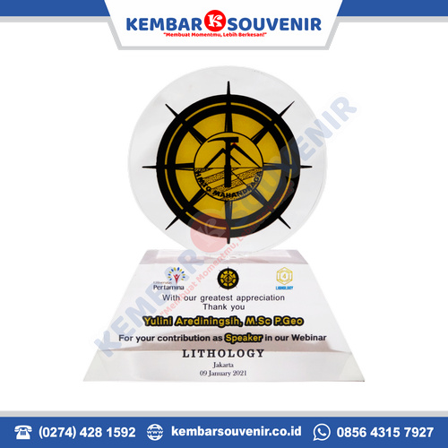 Plakat dari akrilik kini menjadi pilihan utama bagi banyak instansi, perusahaan, dan lembaga karena tampilannya yang modern, kuat, dan bisa disesuaikan dengan berbagai desain. Contoh berikut menunjukkan salah satu desain plakat dari akrilik yang digunakan sebagai bentuk penghargaan kepada pembicara dalam acara webinar bertema geologi.