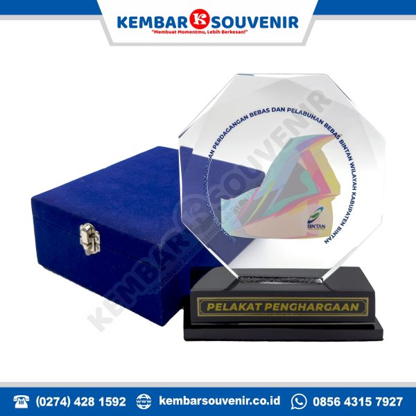 Pada bagian tengah plakat, terdapat elemen grafis abstrak berwarna-warni yang dicetak presisi, dilengkapi logo bertuliskan “BINTAN” sebagai identitas visual acara atau instansi. Di sekeliling grafis, teks melingkar berfungsi sebagai penjelas nama kegiatan atau bentuk penghargaan, membuat plakat diamond ini tampil informatif sekaligus estetis.