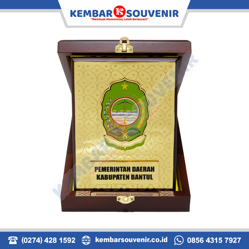 Bagian depan plakat menampilkan logo Pemerintah Daerah Kabupaten Bantul yang diukir dengan presisi dan dilapisi warna emas mengilap. Warna hijau dan kuning pada elemen logo menambah kesan resmi dan berwibawa. Kualitas ukiran yang rapi menunjukkan keterampilan tinggi dari tim pengrajin Kembar Souvenir, yang sudah berpengalaman membuat berbagai plakat kayu unik untuk instansi dan perusahaan di seluruh Indonesia.