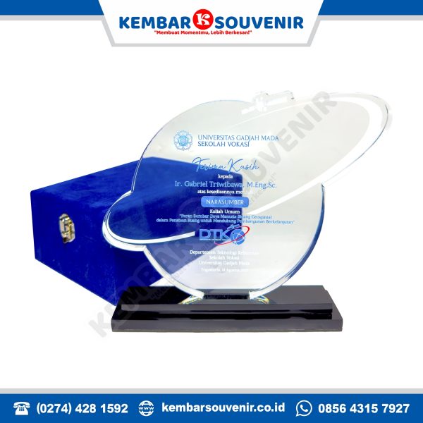 Desain ini semakin eksklusif dengan tatakan akrilik hitam glossy yang menambah kesan mewah dan kokoh saat dipajang. Kombinasi warna putih, biru, dan hitam mencerminkan karakter institusi pendidikan serta kesan formal yang sangat cocok untuk kegiatan kunjungan kerja atau studi banding.