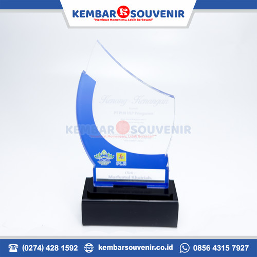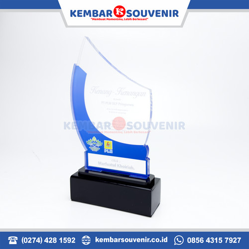 Bagian bawah souvenir akrilik menggunakan dudukan berwarna hitam glossy yang kokoh, menambah nuansa mewah dan stabil saat dipajang di meja kerja atau lemari penghargaan. Desain kombinasi akrilik transparan dan aksen biru royal membuat tampilan keseluruhan tampak profesional serta berkelas—ideal untuk perusahaan, lembaga, maupun universitas.
