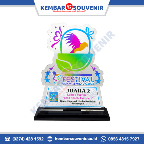 Kembar Souvenir menawarkan ukuran plakat standar custom. Klien bisa memilih bentuk dan ukuran sesuai keinginan. Misalnya, plakat berbentuk logo perusahaan atau maskot acara.